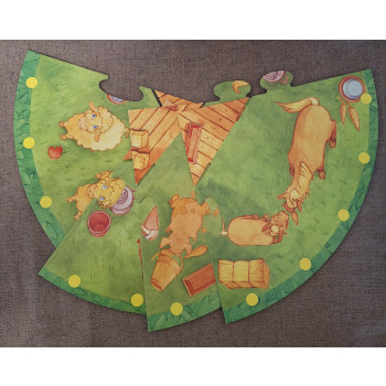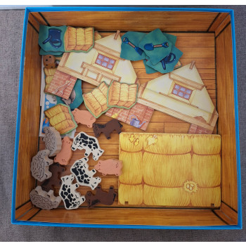 Hiánytalan,jó állapotú,nyomtatott magyar nyelvű játékleírással. 4 éves kortól, 2-4 játékos részére.Vedd ki az állatokat a 3D-s istállóból,és vidd őket a legelőre. Az állatokat azonban csak akkor veheted ki,ha két egyforma tárgyat találsz a szalmabálák alatt.Az a játékos nyer,aki először gyűjti be a kártyáin szereplő 3 állatot.A játék célja:Keress két egyforma tárgyat a szalmabálák alatt,és cseréld el őket a játékos kártyáin ábrázolt három állatra,majd vidd az állatokat a legelőre.