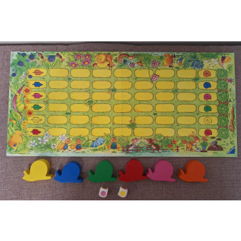 Hiánytalan, jó állapotú,nyomtatott magyar nyelvű szabállyal. 3,5 éves kortól,2-6 játékos részére.A csigafutam egy szórakoztató társasjáték,amely a különböző csigák sebességének összemérésével ismerteti meg a gyermekeket a színekkel és a vetélkedés élményével.Melyik csiga nyeri a futóversenyt?