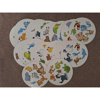 Hiánytalan, a doboza viseltes, a kártyák jó állapotúak, magyar nyelvű játékszabállyal. 4 éves kortól, 2-5 játékos részére.A Dobble Kids, mint a többi Dobble játék egy vidám pörgős társasjáték, amelyet ebben a változatban a kicsik is élvezni fognak, hiszen kifejezetten gyerekekre szabták. A dobozban egy 30 lapos kártyapaklit találsz, amelyeken 6 állat képe található. 30 különböző állat jelenik meg a Dobble Kids kártyákon, és bármely két lapot egymás mellé helyezve, csak egy azonos állat lesz látható a kártyákon. Ki lesz a leggyorsabb, aki megtalálja a párokat?
