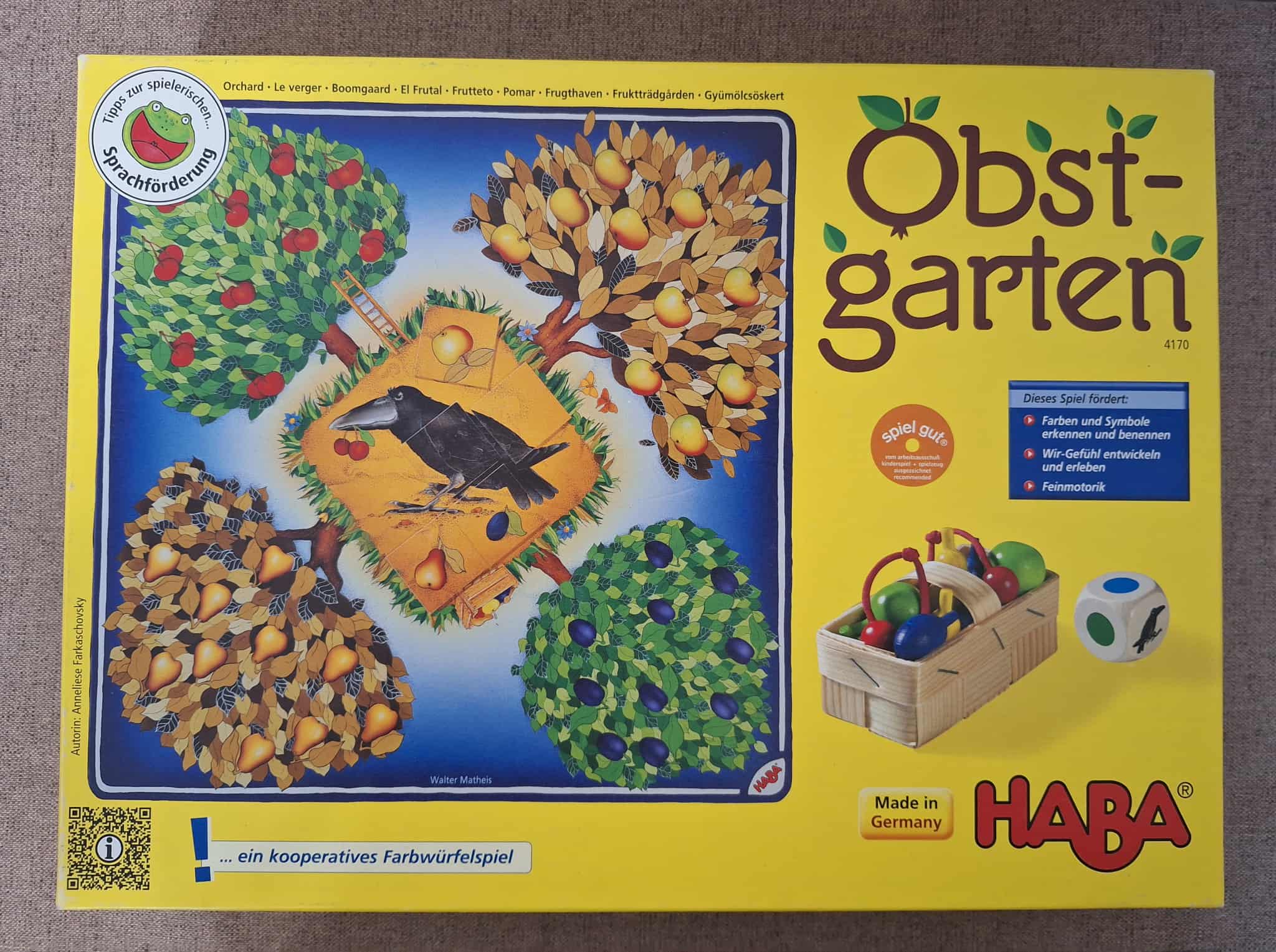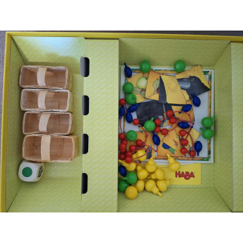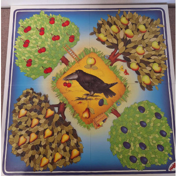 Hiánytalan, nagyon jó állapotú,nyomtatott magyar nyelvű szabállyal.3 éves kortól,1-8 játékos részére.Kooperatív társasjáték 1-8 játékos részére 3–6 éves korig. A gyümölcsöskertben a fák telis-tele vannak gyümölcsökkel. Az alma, körte, cseresznye, szilva már mind megérett. Gyorsan le kell szedni őket, mert a ravasz holló csak arra vár, hogy elkapkodja az érett gyümölcsöket. A gyerekeknek meg kell próbálni leszedni a gyümölcsöket a fáról, még mielőtt a holló ellopná őket.