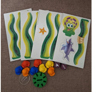 Belül teljesen új,nyomtatott magyar nyelvű játékleírással. 4 éves kortól,2-4 játékos részére. A kis rákok száguldanak,hogy meglátogassák Sallyt a tengeri csillagot. Útközben Jolly Octopus körül mászkálnak: hol egy kar fölött,hol pedig alatta. De légy óvatos! Jolly annyira csiklandós,hogy nem szabad hozzáérni. A rákok semmilyen körülmények között nem mászhatnak át a bekötözött karján :az egyik rák véletlenül megcsípte,amikor Harry Cápa megijesztette. A pimasz cápa szereti bosszantani a rákokat.A játék célja: Aki mindkét rákkal elsőként ér Sallyhez a tengeri csillaghoz,megnyeri a Jolly Octopus körüli viharos versenyt.