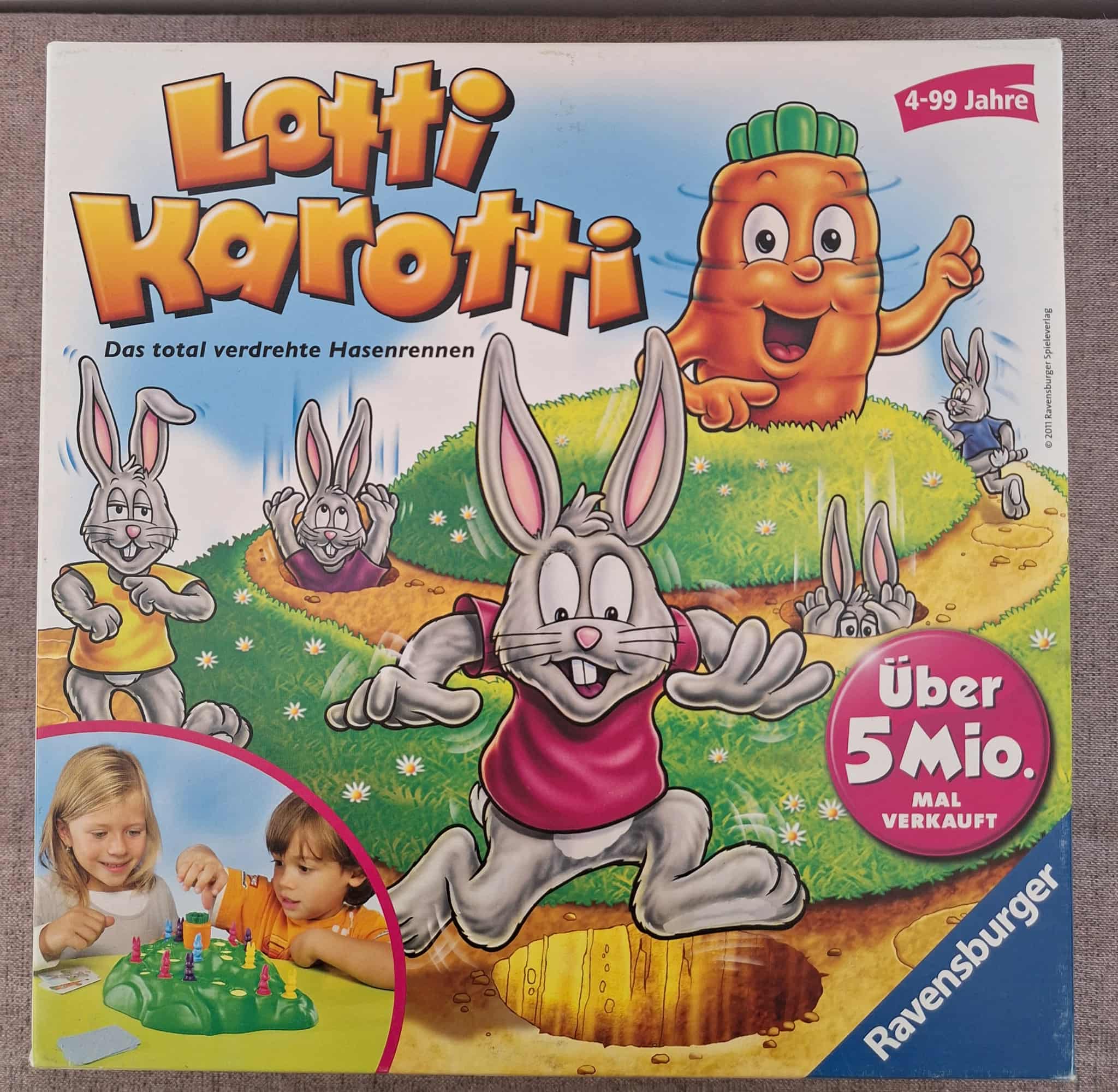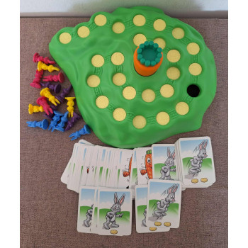 Hiánytalan, jó állapotú,nyomtatott magyar nyelvű szabállyal.5 éves kortól,2-4 játékos részére.A kis nyulak versenyt rendeznek a domb tetején lévő répáig.De az út furfangos,hiszen itt ott lyukak jelennek meg amibe a kis nyuszik belepottyanhatnak. Vajon ki lesz az első aki felér a domb tetejére?