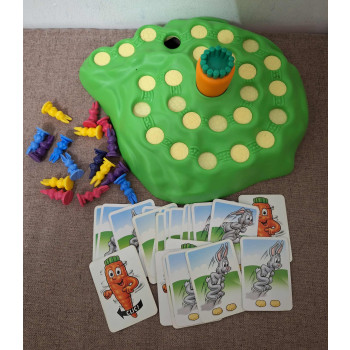 Hiánytalan, a doboza viseltes és a kártyákon látszik kicsit a használat,nyomtatott magyar nyelvű szabállyal.4 éves kortól,2-4 játékos részére.A kis nyulak versenyt rendeznek a domb tetején lévő répáig.De az út furfangos,hiszen itt ott lyukak jelennek meg amibe a kis nyuszik belepottyanhatnak. Vajon ki lesz az első aki felér a domb tetejére?
