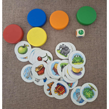 Hiánytalan, jó állapotú,nyomtatott magyar nyelvű játékleírással.4 éves kortól,2-4 játékos részére. A korongokon különböző képek szerepelnek.Ezekből ötöt takarjunk le színes kupakokkal.Majd meg kell mondjuk,hogy melyik színű kupak alatt milyen kép van.De nem akármelyiket,hanem amelyiket dobtuk a kockával.