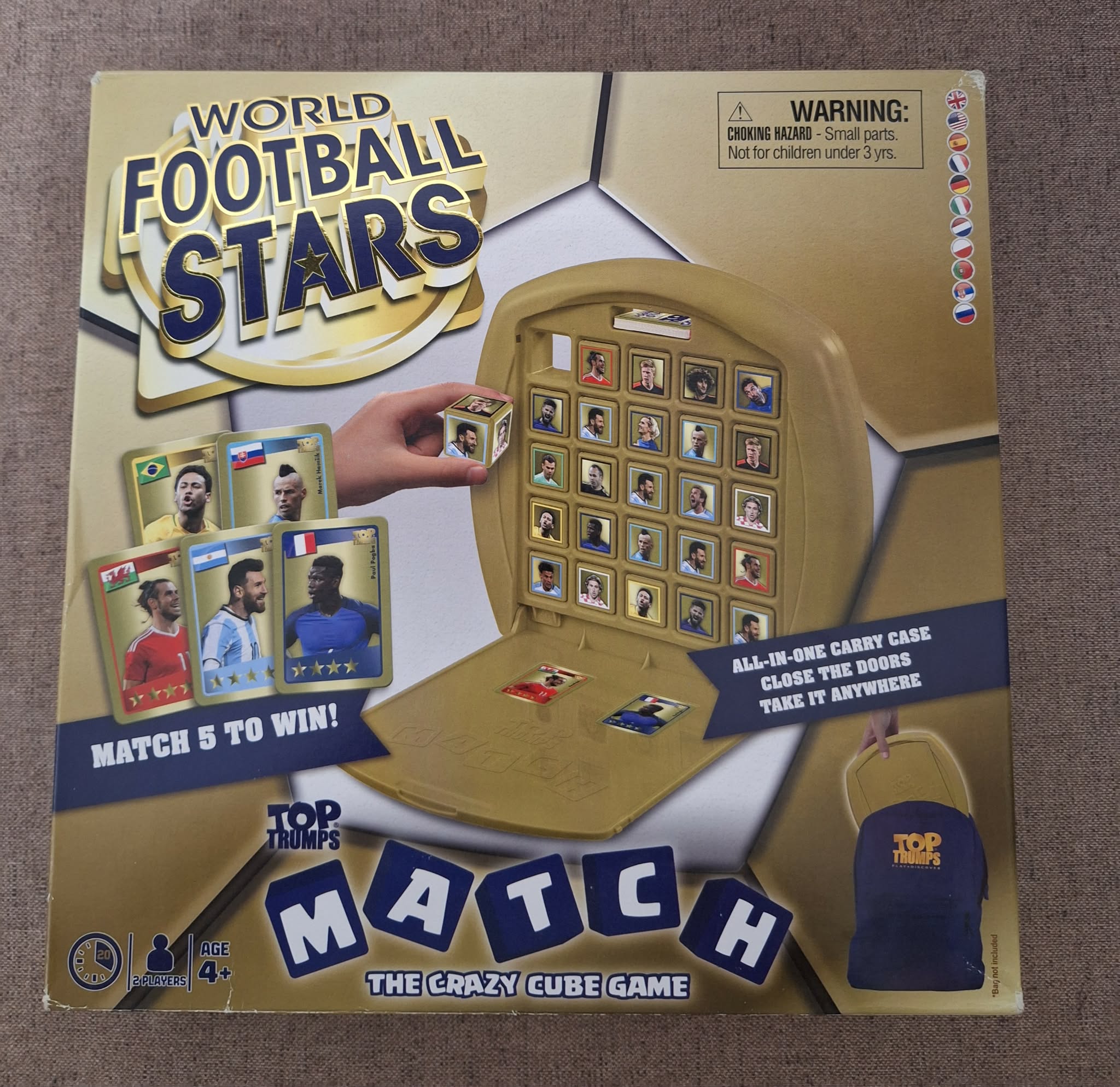 Hiánytalan,jó állapotú,nyomtatott magyar nyelvű játékleírással. 4 éves kortól, 2 játékos részére. A játék célja:Ha 5 kocka egy sorban egyezik, akkor pontokat kapsz.Minden sor egy egyezésnek számít.Az a játékos nyer,aki először szerez 5 (vagy 6) pontot.A sor lehet vízszintes,átlós vagy függőleges.A kockákon és a kártyákon 15 szimbólum található.Ha a sor megegyezik az egyik kártyáddal,több pontot kapsz.