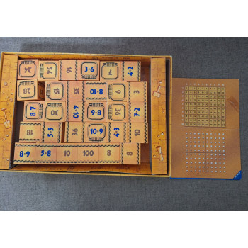 Hiánytalan,a doboza viseltes,és a kartonlap ragasztva lett de a kockák jó állapotúak,nyomtatott magyar nyelvű szabállyal.7 éves kortól 2-6 játékos részére.Ebben a kalandos egymásra pakolgatós játékban a gyerekek játszva tanulják meg a szorzást.Az együtt építés elősegíti a csapatszellemet és fejleszti a finommotorikus készséget is.A gyerekek maguk döntik el mely feladatokat oldják meg,maguk ellenőrizhetik,hogy megoldásuk jó-e.