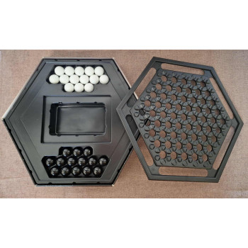 Hiánytalan,a doboza kicsit viseltes de maga a játék jó állapotú,nyomtatott magyar nyelvű szabállyal.8 éves kortól,2 játékos részére.A játék célja: Elsőként leszorítani az ellenfél hat golyóját a játéktábláról.