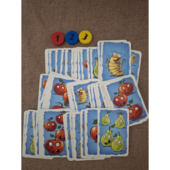 Hiánytalan,nagyon jó állapotú,nyomtatott magyar nyelvű játékszabállyal. 7 éves kortól,2-5 játékos részére.A játék célja: Figyelmesen számold össze fejben ,a kártyákon található almákat,körtéket és kukacokat,majd mondd meg a pontos mennyiséget,mielőtt azt egy játékostársad tenné meg. Ha jól csináltad,akkor ezért megkapod a szüretkártyát.Az nyer,aki a legtöbb szüretkártyát gyűjti össze.