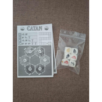 Hiánytalan, jó állapotú,nyomtatott magyar nyelvű játékszabállyal. 7 éves kortól, 1-4 játékos részére.A játékfelületen Catan szigete látható,utak,települések,városok és lovagok szimbólumaival. A játékosok feladata a játék folyamán Catan szigetén az utak,települések,városok és lovagok betelepítése. A betelepítés azt jelenti,hogy a megfelelő szimbólumot a játékos ikszel jelöli.A betelepítésnek nyersanyag költsége van.A szükséges nyersanyagot 6 nyersanyag kockával dobják ki a játékosok.Akkor,amikor egy játékos sikeresen beépít,azaz a megfelelő szimbólumot bejelöli,a szimbólumban feltüntetett számnak megfelelő pontot írhat magának jóvá.A játékot az a játékos nyeri,aki a játék végéig a legtöbb pontot írta magának jóvá.