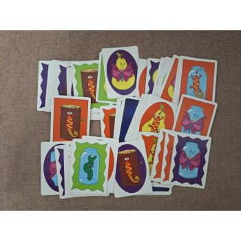 Hiánytalan,jó állapotú, magyar nyelvű játékszabállyal.7 éves kortól,2-6 játékos részére.Figyeld meg alaposan a színes kártyákat.Milyen dolgon csücsülnek az állatkák?Milyen formája van a háttérnek?Milyen színű a háttér?Nagyon figyelj,mert ha találsz 2,vagy 3 olyan tulajdonságot,ami megegyezik a lerakott kártyával,akkor szerezhetsz pontokat.