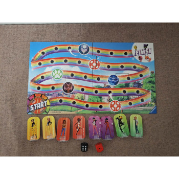 Hiánytalan,jó állapotú,nyomtatott magyar nyelvű játékleírással. 6 éves kortól,2-4 játékos részére.Egy izgalmas kocka-versenyjáték a „Miraculous” TV-sorozat szuperhőseivel.Marinette, Adrien, Zoé és Alya valójában teljesen normális tinédzserek... De egy különleges ékszer, egy Miraculous és a hozzájuk tartozó apró varázslények, a Kwamik segítségével a 4 barát szuperhősökké tud átváltozni! Ezután Marinette-ből Katica , Adrienből Fekete Macska, Zoé-ból Vesperina és Alyából Rena Rouge lesz. Együtt szállnak szembe a 3 gonosszal: Hawk Moth, Kaméleon és Mayura. Segíts a szuperhősöknek, győzzétek le a 3 gonosztevőt a Kockapárbajban, és próbáljatok minél gyorsabban elérni a célt, hogy megvédjétek a Kwamikat.A játék célja, hogy a saját két bábuval elsőként érjétek el a célt.