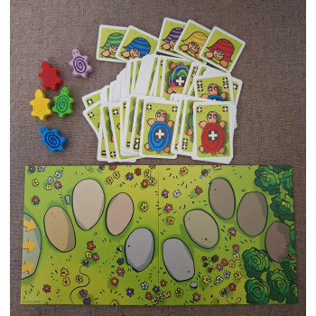 Hiánytalan,jó állapotú,nyomtatott magyar nyelvű játékszabállyal.5 éves kortól,2-5 játékos részére.A teknősbékák ritkán sietnek-de néha találnak okot egy kis versenyfutásra-például a friss,zöld fejessaláta gyors elérése érdekében a kert másik végébe.S mivel nem elég kitartóak,gyakran megpróbálják a másik hátára felmászva egy kicsit cipeltetni magukat.Úgy tűnik a nagy kavarodásban néha egy teknősbéka rossz irányba caplat-de ennek ellenére ,végül is elsőként élvezheti az ízletes salátalevelet.A cél:Minden játékos elsőként próbálja meg a saját színű teknőcét a saláta ágyásba ( az utolsó mező) juttatni.