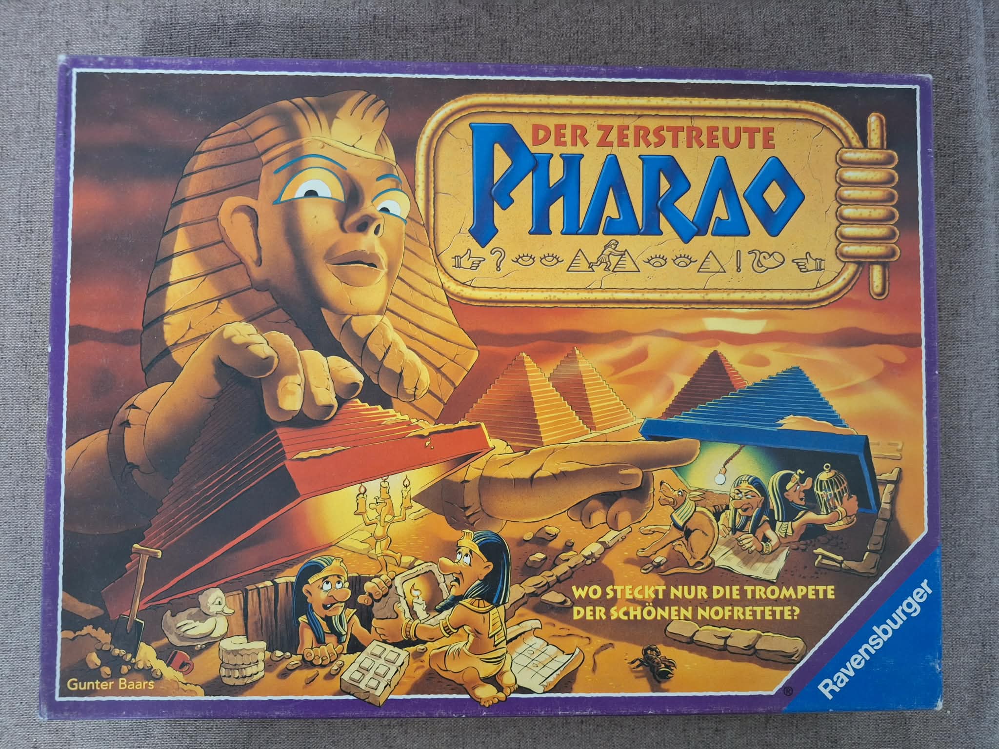 A korongokat takaró karton hiányzik,de ez csak esztétikai dolog ,nélküle is játszható a játék, a doboza viseltes,de maga a játék jó állapotú,nyomtatott magyar nyelvű játékleírással.8 éves kortól,2-5 játékos részére.A fáraó elrejtette kincseit a piramisok alá.De elfelejtette melyik kincset melyik piramis alá rejtette. Segíts neki megtalálni őket.