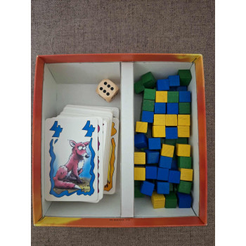 Hiánytalan,a doboza kopott,de maga a játék jó állapotú ,nyomtatott magyar nyelvű játékszabállyal. 8 éves kortól, 2-6 játékos részére.Kukoricát,kukoricát! Kiáltja számtalan csőr a baromfiudvaron.A tyúkok,libák,kacsák,pulykák mindig éhesek,és ha rajtuk múlna,egy pillanatra sem hagynák abba az evést. Ami azt illeti,a róka is mindig éhes,ámbátor egész más menüre fáj a foga... A játék célja:A csirkék,kacsák és libák kellemesen kigömbölyödnek,ha bőven jutnak élelemhez.Ugyanez igaz a ravaszdi rókára is,aki bármiféle óvatlan szárnyast szívesen fogyaszt.....A játékot az a játékos nyeri,aki a játék végén a legkövérebb baromfikkal és a legtáplálóbb kukoricákkal rendelkezik.