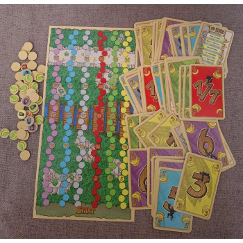 Hiánytalan,nagyon jó állapotú,nyomtatott magyar nyelvű játékleírással. 8 éves kortól,3-6 játékos részére.A dzsungelben nagy a kiabálás.A hegyi gorillák minden évben új vezetőt választanak,hogy csatlakozzanak a nagymajom közösséghez .Csak a legtöbb banánnal rendelkező gorilla tud új Mr. Kongó lenni.Azonban nem minden majom talál annyi banánt,mint amennyit először sejt! Még a szüret előtt azzal dicsekednek,hogy hány banánt találnak majd a dzsungelben De csak akkor kapnak pontokat,ha az előrejelzésük pontosan megegyezik a végeredménnyel. A játék célja: Az nyeri a játékot .aki először gyűjt össze 25 banánt.A banánt azonban csak az szerezheti meg,aki helyesen tippeli meg,hogy egy kör után mennyi gyümölcsöt fog kapni.Csak akkor lehet lépésről lépésre közelebb kerülni a győzelemhez,ha az előrejelzés megfelel a ténylegesen elért eredménynek.