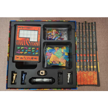 Hiánytalan, jó állapotú,nyomtatott magyar nyelvű játékleírással.8 éves kortól,2-4 játékos részére.Mindenki kap egy 12 darabból álló,különböző színű és formájú színes lapkákat .Valamint mindenki kap minden kör elején egy új feladattáblát.Egy speciális szimbólumokkal ellátott kockával dobunk ,és a kocka határozza meg,hogy a készletünkből melyik lapkákat használhatjuk az adott körben a feladat megoldásához.Megfordítjuk a homokórát és egyszerre mindenki megpróbálja maradéktalanul lefedni a feladattábláján lévő üres területet a megfelelő lapkákkal.Akinek ez sikerül elsőként mielőtt a homokóra leperegne drágaköveket kap.A játékot az nyeri akinek a játék végén a legértékesebb drágakőgyűjteménye lett.