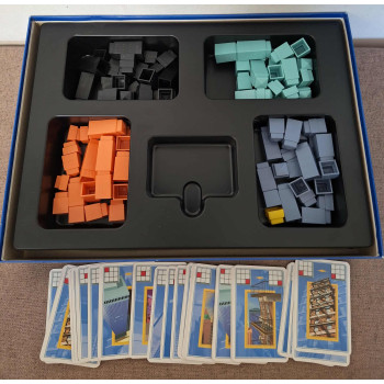 Hiánytalan,jó állapotú,nyomtatott magyar nyelvű játékleírással. 10 éves kortól,2-4 játékos részére.Építkezési láz dúl Manhattanben,de nem csupán ott,hanem a világon mindenfelé épülnek toronyházak.Játékosként részt vehetsz a Sydney-ben ,a New York-i Manhattanben,Frankfurtban,Sao Paulóban és Kairóban folyó építkezésekben.A cél: minél több toronyház emelése.Választhatsz,hogy építész akarsz-e lenni ,vagy abban vagy érdekelt,hogy a játékostársad által emelt felhőkarcolókat magadnak megszerezd.Te magad döntesz.De ki is engedné át szívesen a nehezen felépített magas házait az ellenfélnek?