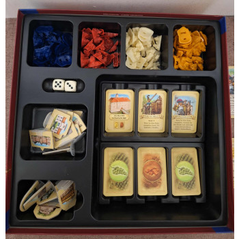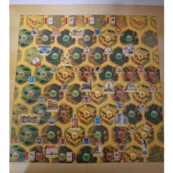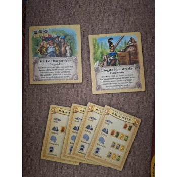 Hiánytalan,belül szinte új állapotú,nyomtatott magyar nyelvű játékleírással. Egyes kártyákon NÉMET felirat van,de ezekről a szabályban részletesen szó esik, így könnyedén játszható. 10 éves kortól, 3-4 játékos részére.Bécs térképe különféle tájakból áll,ahol a következő erőforrásokat bányásszák: fa,szőlő,agyag,kő,gabona.Te és a többi játékos kártyák formájában tartjátok birtokban ezeket az erőforrásokat,és utak építésére,települések és nevezetességek létrehozására használjátok a régi Bécs környékén. A kockával dobott régiók hozamot termelnek,ha rendelkezel ott településsel akkor hozamot szerezhetsz. A játékot 3 településsel azaz 3 győzelmi ponttal kezditek,aki eléri a 10 ( 3 játékos esetén a 12) győzelmi pontot az nyer.