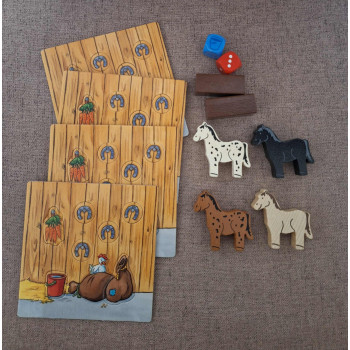 Hiánytalan, jó állapotú,nyomtatott magyar nyelvű szabállyal.3 éves kortól,2-4 játékos részére. A játékosoknak vissza kell hozniuk lovaikat a legelőről.Útjuk során különböző tárgyakat is össze kell gyűjteniük.A soron lévő játékos dob mindkét kockával,majd dobás után eldönti,hogy melyik kocka utasításait szeretné követni.Csak abban az esetben léphet be az istállóba a játékos a lovával,ha a kirakótábláját már teljesítette.Az nyer aki elsőként ér vissza a legelőről az istállóba.