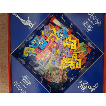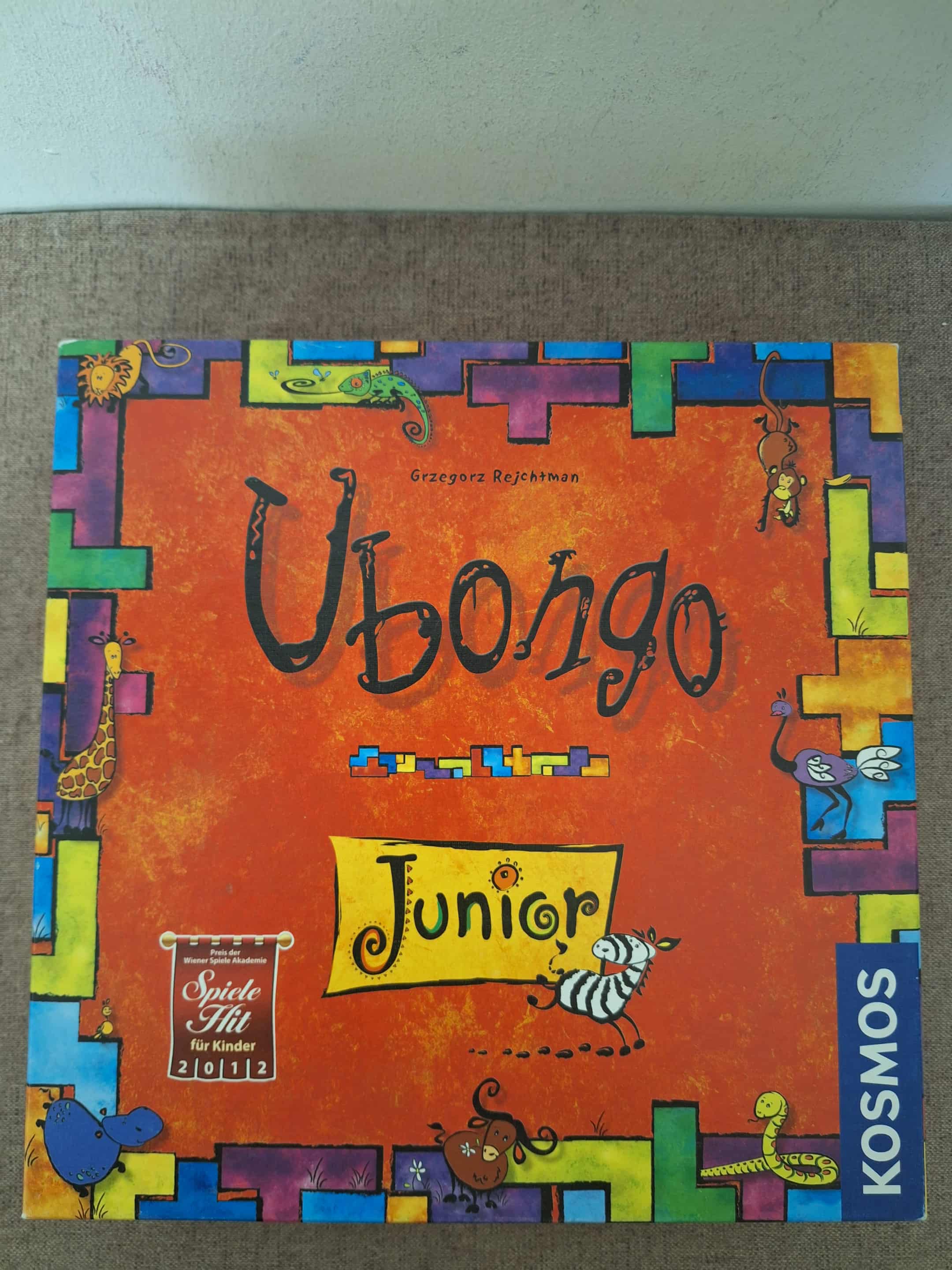Hiánytalan ( nem az eredeti húzózsák van benne),a doboza egy nagyon picit kopott a saroknál,de maga a játék jó állapotú,nyomtatott magyar nyelvű szabállyal.5 éves kortól,1-4 játékos részére.Az Ubongo gyerek változata,színes állatos lapkákkal.A kártyák kétoldalúak,könnyű és nehezebb feladványokkal.Minden játékos egyszerre,a lehető leggyorsabban felrakja állatait a kirakós táblájára.A leggyorsabb Ubongót kiált és drágaköveket kap.Akinek a végén a legtöbb drágaköve van az lesz a győztes.