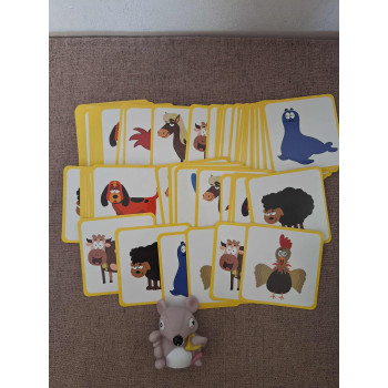 Hiánytalan,jó állapotú,nyomtatott magyar nyelvű játékleírással. 6 éves kortól, 2-6 játékos részére.Mú, Vau-vau,kukurikú...rengeteg állat mászkál a farmon.Emlékszel melyik állatok vannak a kártyákon és utánozták a hangjaikat?Az a játékos kapja a kártyát aki először kapja el az egeret,amikor valaki hibázik.A játék célja: Ki gyűjt össze először öt állatkártyát?