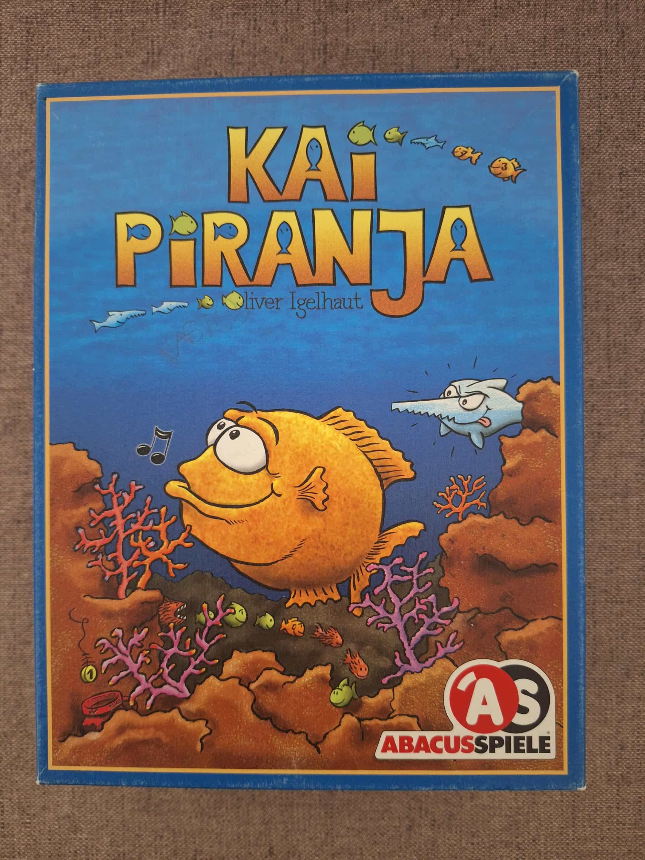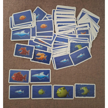 Hiánytalan,nagyon jó állapotú,nyomtatott magyar nyelvű játékleírással. 6 éves kortól, 3-6 játékos részére.Kai Piranja és barátai vidáman úszkálnak. Gyorsan kialakul egy sokféle, nagy és kicsi halakból álló színes konvoj. De mi történik, ha hirtelen megjelenik egy éhes hal? És így a zsákmány egyre kisebb és kisebb lesz,hacsak nem hozzák időben biztonságba.A játék célja: A kártyákon lévő halakból kialakítunk magunk előtt egy konvojt. Egy halat akkor tehetünk a konvojba ha az előző kártyán lévő hallal megegyező nagyságú vagy fajtájú. De vigyázz ha éhes hal kerül a konvojodba akkor megeheti a halaidat,ezért jobb ha időben kifogod őket. Az győz aki a legtöbb halat gyűjtötte be.