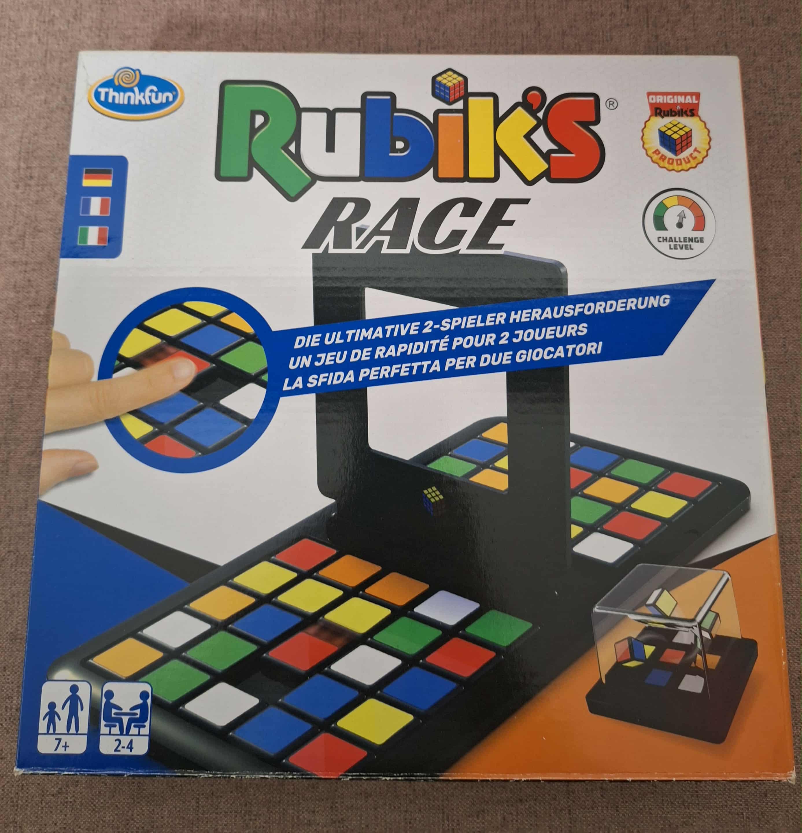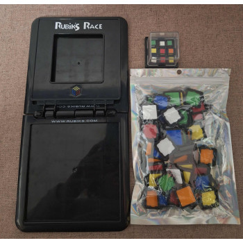 Hiánytalan,jó állapotú,magyar nyelvű játékszabállyal.7 éves kortól,2 játékos részére.A Rubik's Race, azaz Rubik verseny egy gyors tempójú, sorozatképző társasjáték, amely megmozgatja a játékosok agytekervényeit és ujjait egyaránt. Csak meg kell rázni a kicsi, műanyag fedéllel ellátott kockát, majd eltologatni és elcsúsztatni a játéktáblán a megfelelő színekkel ellátott lapokat. A játék győztese az, aki először ki tudja rakni a megfelelő színkombinációt a saját táblarészén.A szabály könnyűnek hangzik, ugyanakkor a játék kihívást jelenthet kicsiknek és nagyoknak is, hiszen nem elég logikusan gondolkodni, gyorsnak és ügyesnek is kell lenni a győzelemhez.