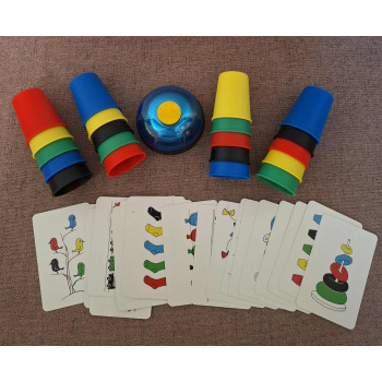 Hiánytalan,a dobozán látszik kicsit a használat de maga a játék jó állapotú,nyomtatott magyar nyelvű szabállyal.6 éves kortól,2-4 játékos részére.Magunkhoz veszünk 5 színes poharat .Felcsapunk egy feladatkártyát,majd mindenki megpróbálja olyan gyorsan megoldani a feladatot ,amilyen gyorsan csak tudja.Melyik madár ül a fa tetején és melyik az alján?Milyen sorrendben lógnak a színes kabátok?Akkor kell a csengőre csapni,ha helyes sorrendben állnak a poharak. Ügyesnek,jó megfigyelőnek és gyorsnak kell lenni.