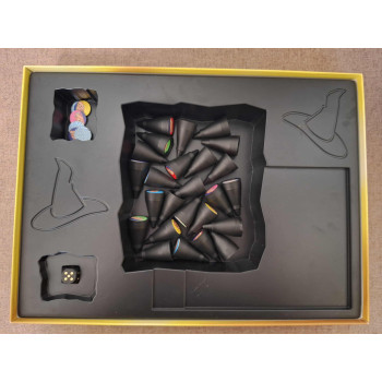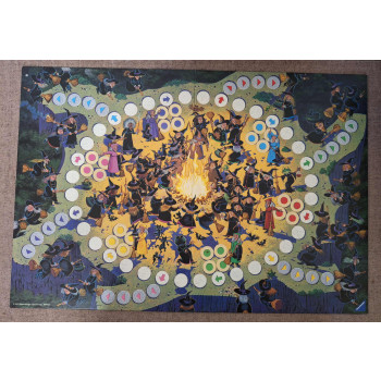 Hiánytalan,jó állapotú,nyomtatott magyar nyelvű szabállyal.8 éves kortól,3-6 játékos részére.A boszorkányéjszakán összegyűlnek a boszorkányok egy nagy, közös táncra. Hogy minél izgalmasabb legyen a buli, mindannyian fekete süveget viselnek. Ahogy keringenek a tűz körül, végül már senki sem tudja, melyik süveg alatt milyen boszi rejtőzik. Mire azonban a nap felkel, minden boszi megtalálja a saját helyét!A kockadobásnak megfelelően kell a bábukkal lépni a mezőn. Célba kell érni minden saját színű boszorkánnyal. Igen ám, de a kalap alatt nem látszik ,hogy ki melyik bábuval lép.Itt bizony lesz egy kis keveredés.Aki valamennyi saját figurájával egyszer körbement a pályán, és elsőként ér a célmezőkre, az győz.